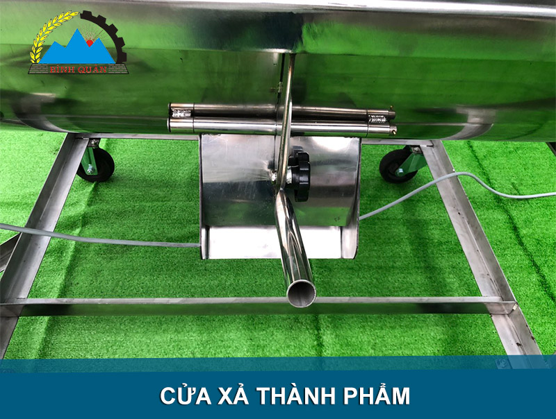 Thành phẩm sau khi trộn sẽ được đưa ra ngoài trực tiếp qua cửa xả bên dưới thùng.