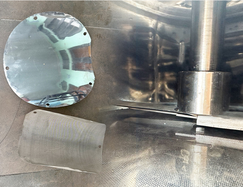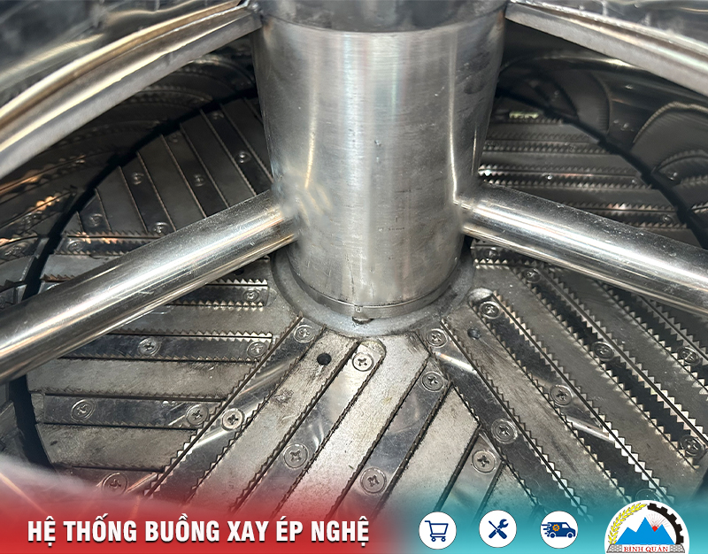 Bên trong buồng làm việc là hệ thống xay - sát bằng đĩa xay - ép có nhiệm nghiền nhỏ nguyên liệu. Sau đó, phần nước cốt sẽ được đẩy ra ngoài qua lưới sàng mịn nâng cao chất lượng thành phẩm thu được