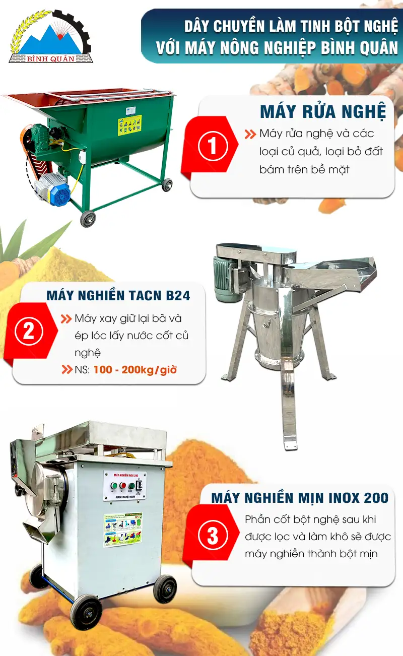 Máy xay ép nghệ liên hoàn là thiết bị kết hợp chức năng xay nhuyễn củ nghệ tươi và ép lấy nước cốt phần bã được giữ lại trong máy. Sau đó, phần nước cốt này sẽ được để lắng gạn lấy tinh bột