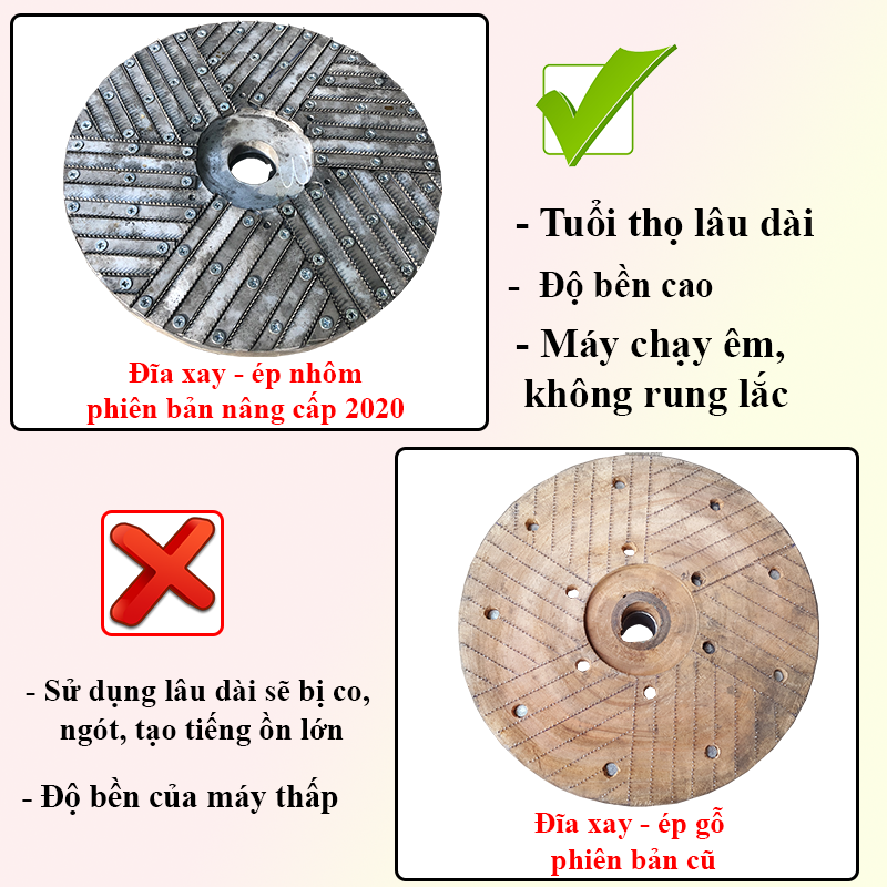 Trước đây, hệ thống mặt đĩa xay - ép được làm bằng liệu gỗ nên tuổi thọ máy sẽ không cao, khi sử dụng trong thời gian dài sẽ co, ngót dẫn đến máy giật, tiếng ồn khi máy làm việc rất lớn.