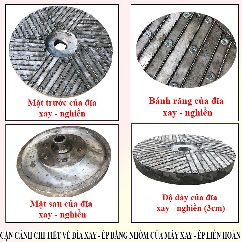 Vì vậy, để cải tiến để máy hoạt động khỏe khoắn hơn công ty Bình Quân đã chế tạo máy xay - ép liên hoàn nghệ phiên bản nâng cấp 2020 cùng đĩa xay - nghiền được làm hoàn toàn bằng chất liệu nhôm cùng các bánh răng cực kỳ dầy dặn (kích thước đường kính 38cm * độ dầy của đĩa 3 cm) hỗ trợ cải thiện hiệu quả cho người lao động các chức năng cải tiến giúp quá trình xay – ép chưa bao giờ đơn giản đến vậy. Thời gian của máy được sử dụng lâu dài, máy hoạt động không bị giật an toàn cho người dùng.