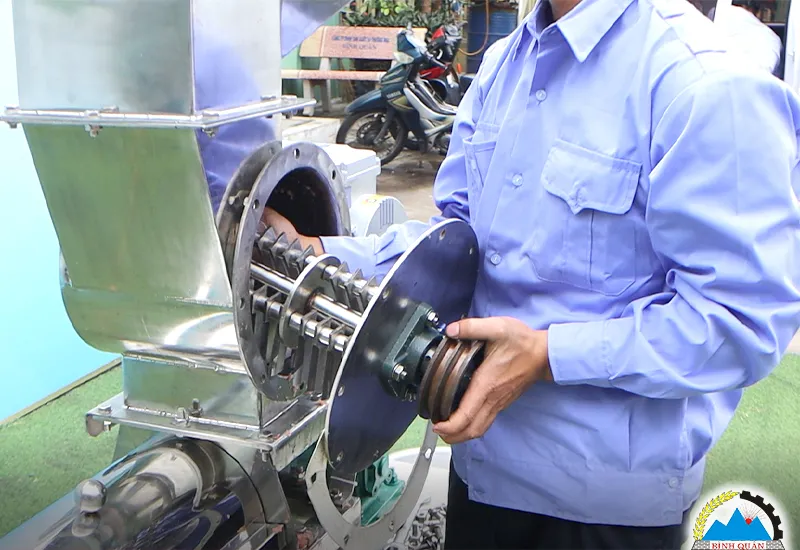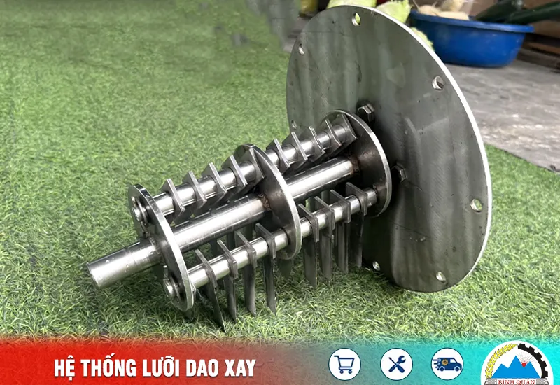 Buồng xay sẽ bao gồm các dao băm 2 lưỡi được làm bằng inox tạo sức va đập cho nguyên liệu nghiền được nhỏ sau đó nguyên liệu sẽ chui qua mắt sàng và đi tới trục xoắn ép.