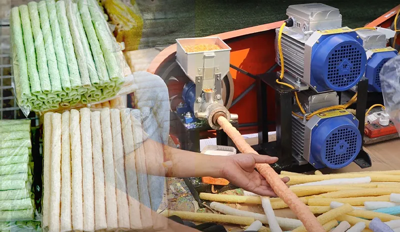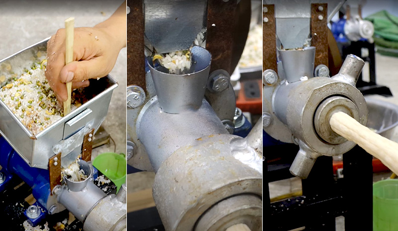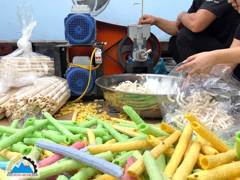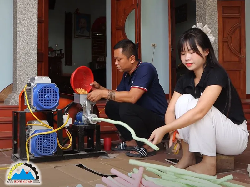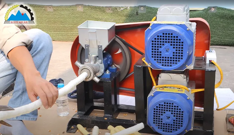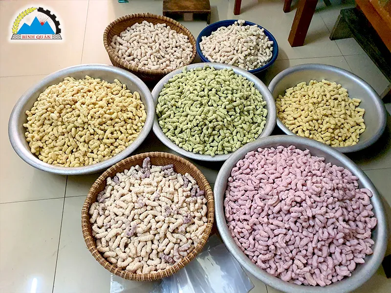 - Hỗn hợp lần lượt được bón xuống ống dẫn vào ruột bỏng, thực hiện nghiền nhỏ và ép hỗn hợp vào khuôn. Đồng thời, thổi phồng qua bép bỏng và đưa thành phẩm ra ngoài