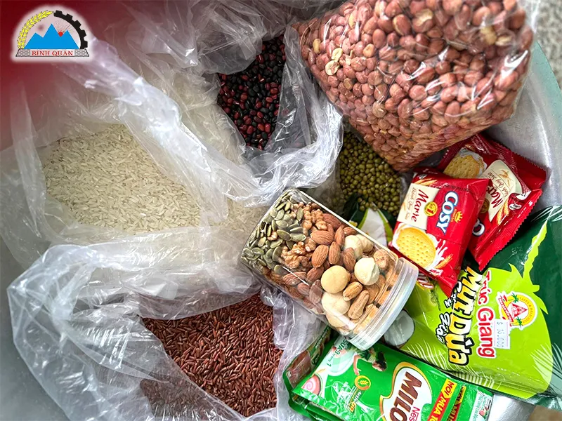 - Cho gạo, đường và các loại hạt, bánh quy, mì tôm sống bóp vụ tất cả đem trộn đều