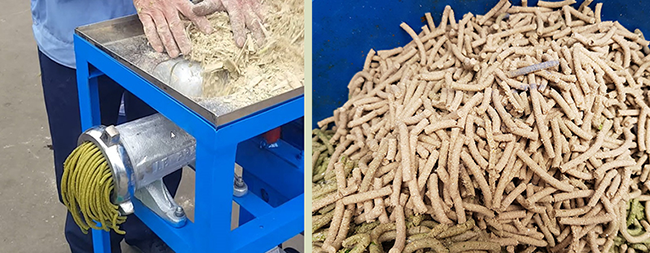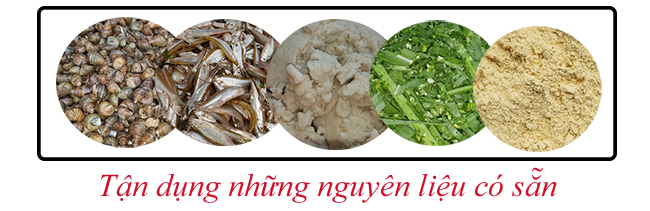 Nguyên liệu dùng để chủ yếu đùn cám gồm bột cám gạo, rau bèo, tép nhỏ, cua, bã bia, xương chân gà nhỏ,... Bà con lưu ý độ ẩm của nguyên liệu dao động từ 30 - 40%.
