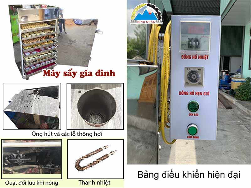 Ngoài ra, ống hút và 2 quạt đối lưu khí nóng được có nhiệm vụ hút độ ẩm trong buồng sấy giúp thực phẩm được khô đều, chất lượng.